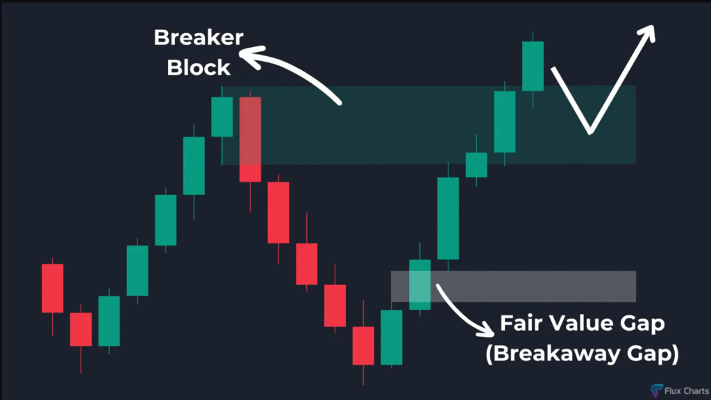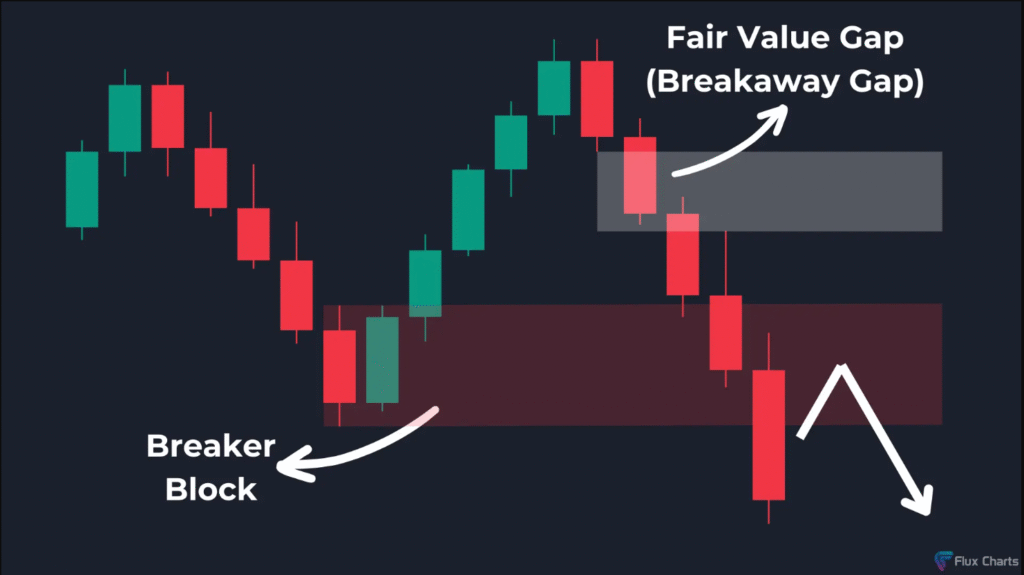 تكوين Breaker Block هابط: إذا أغلق السعر تحت Order Block صاعد، يتم تكوين Breaker Block يتحول إلى منطقة مقاومة. وبهذا تصبح FVG فجوة انفصالية هابطة.