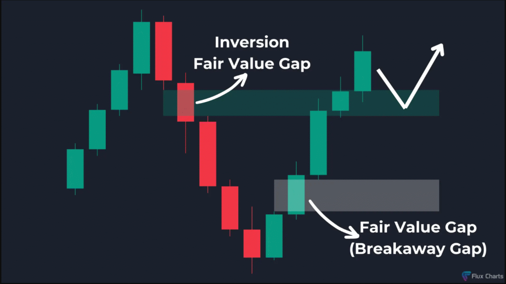 تكوين IFVG صاعد: إذا أغلق السعر فوق FVG هابط، يتم تكوين فجوة معكوسة، والتي تعمل لاحقًا كمنطقة دعم، مما يجعل FVG فجوة انفصالية صاعدة.