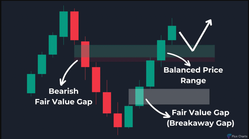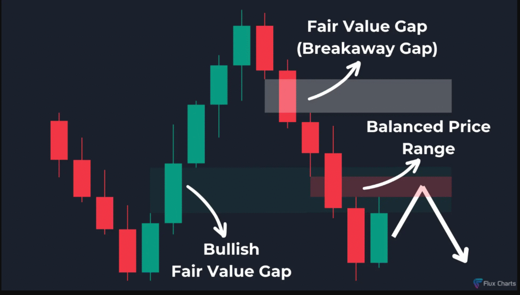 تتكوّن فجوة سعرية عادلة (FVG) من الشموع الهابطة بعد الانعكاس.
