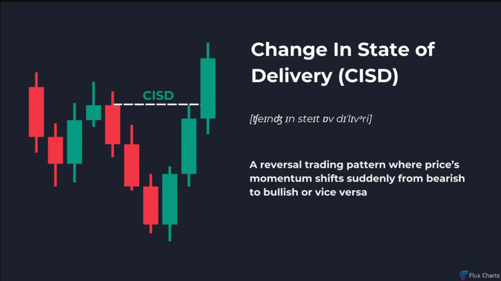 يُعد “تغيير في حالة التسليم” (Change In State of Delivery – CISD) من المفاهيم الشائعة في التداول السعري، ويستخدمه متداولو حركة السعر وخاصة من يتبعون منهجيات “السمارت موني” أو ICT. يحدث CISD عندما يكون هناك تحول مفاجئ في الزخم السعري من الاتجاه الصاعد إلى الهابط أو العكس، ما يُشير إلى احتمال انعكاس في اتجاه السوق.