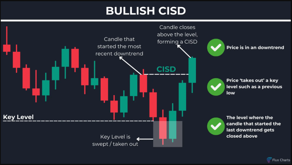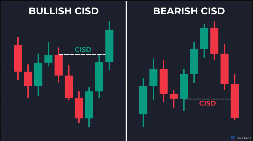 CISD هو إشارة مبكرة لانعكاس الاتجاه، ويعتمد على حركة مفاجئة من مستويات السيولة.