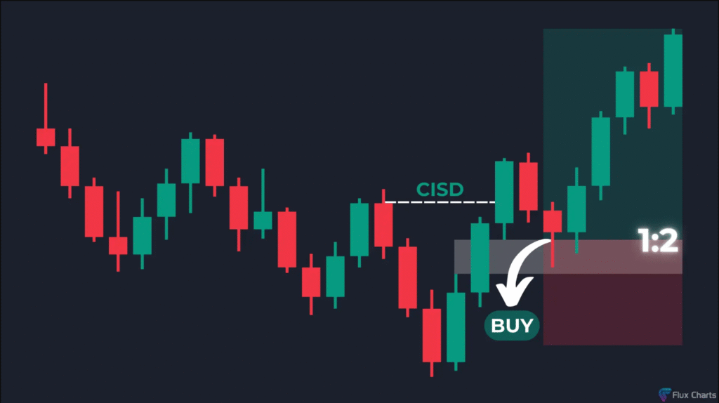 عند ظهور CISD صاعد: يعني أن السوق قد يتحول إلى الصعود، ويمكنك البحث عن فرص شراء من مستويات مثل الفجوات السعرية العادلة (Fair Value Gaps – FVG) أو البلوكات السعريّة (Order Blocks – OB).