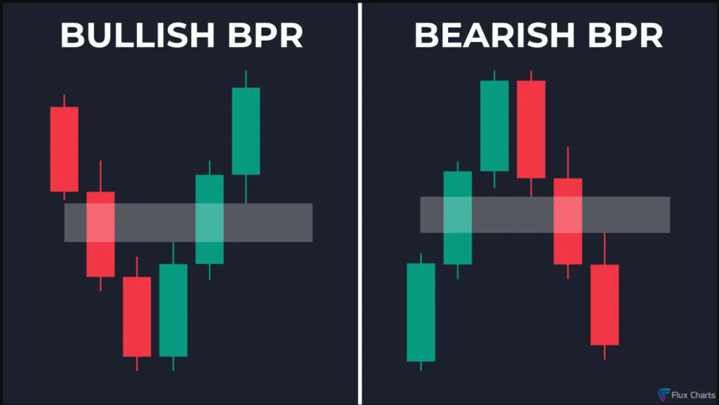 تكوين BPR صاعد: إذا تشكلت FVG صاعدة جديدة تتداخل مع FVG هابطة، يتم تكوين نطاق سعري متوازن يعمل كمنطقة دعم قوية، وتتحول الفجوة الأصلية إلى فجوة انفصالية.