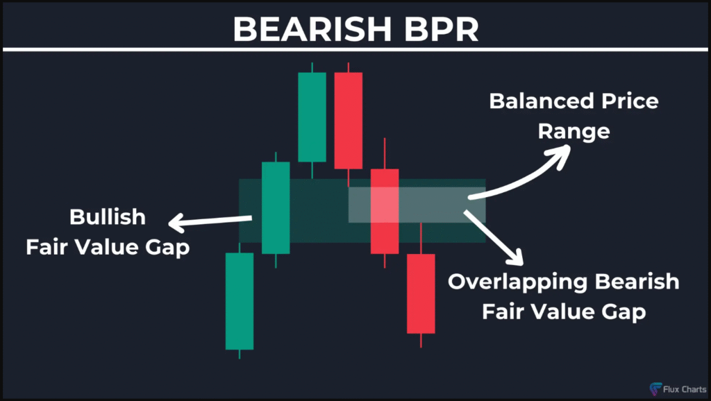 تكوين BPR هابط: إذا تشكلت FVG هابطة جديدة تتداخل مع FVG صاعدة، يتم تكوين نطاق سعري متوازن يتحول إلى مقاومة قوية، وتصبح الفجوة الأصلية فجوة انفصالية.
