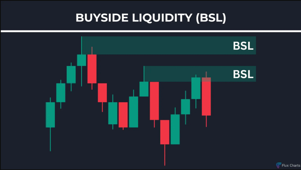 - سيولة الشراء (Buyside Liquidity – BSL):تشير إلى المستويات على الرسم البياني حيث يضع البائعون على المكشوف أوامر وقف الخسارة الخاصة بهم. وغالبًا ما تكون هذه المستويات عند قمم النطاقات.