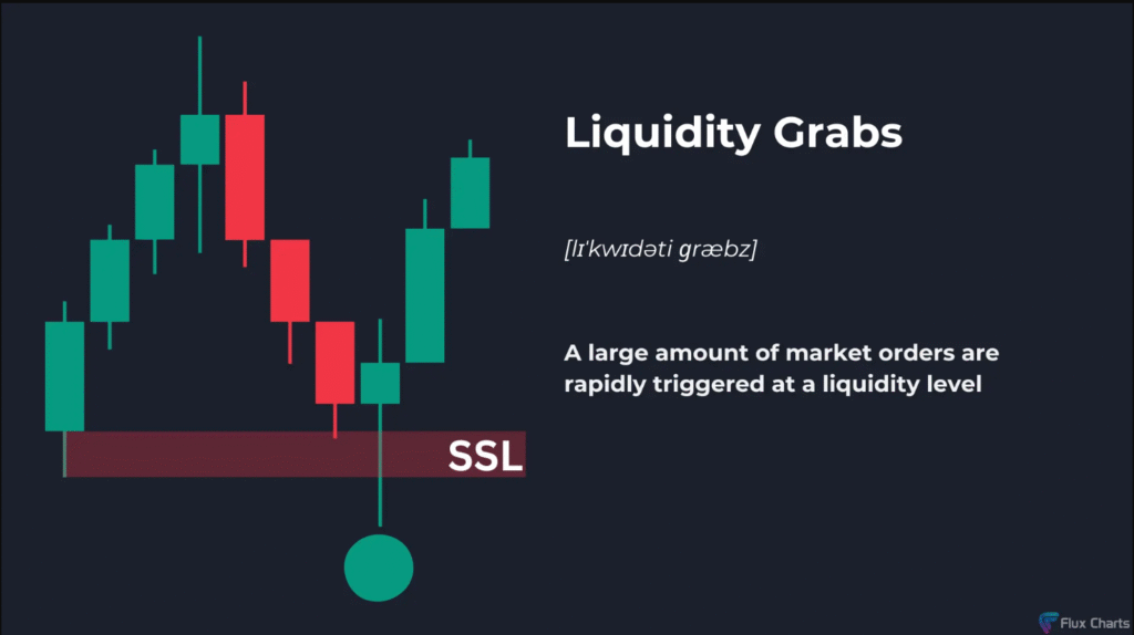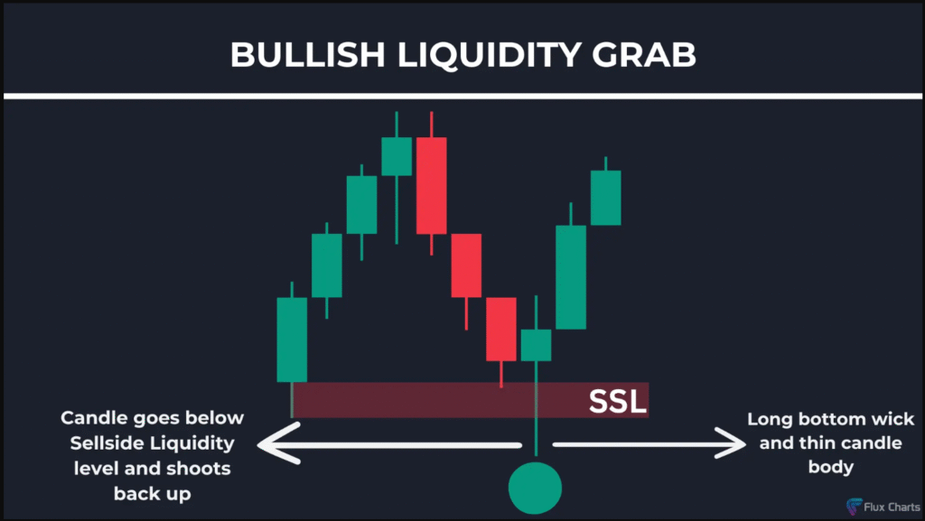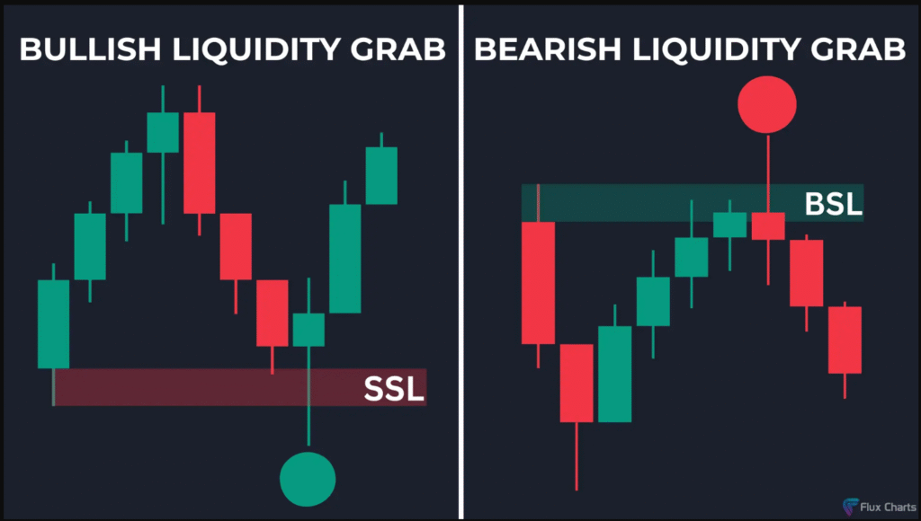 يتحرك السعر فوق/تحت مستوى السيولة، ويمكن أن يتماسك قليلًا ثم ينعكس. - القبض على السيولة (Grab):