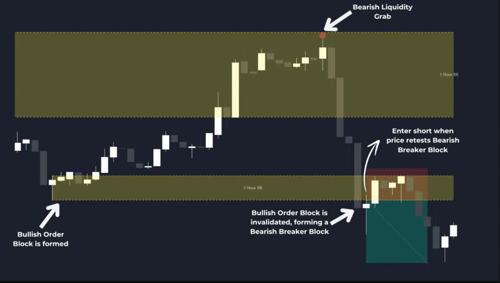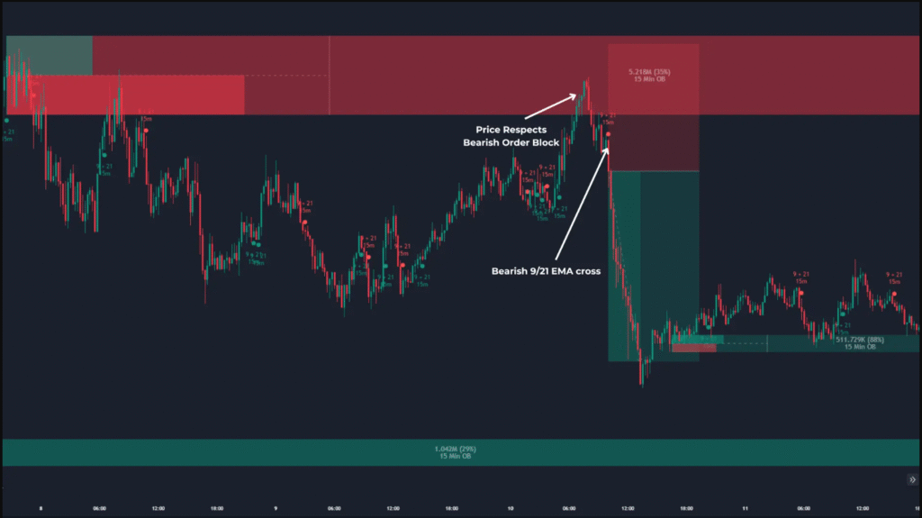 عندما يعود السعر إلى هذه المناطق بعد CHoCH هابط، يمكن فتح مركز بيع، متوقعين أن يكون البائعون نشطين كما كانوا عند تشكيل تلك المناطق مسبقًا.
