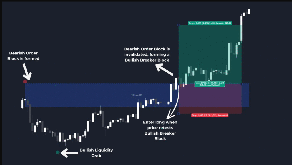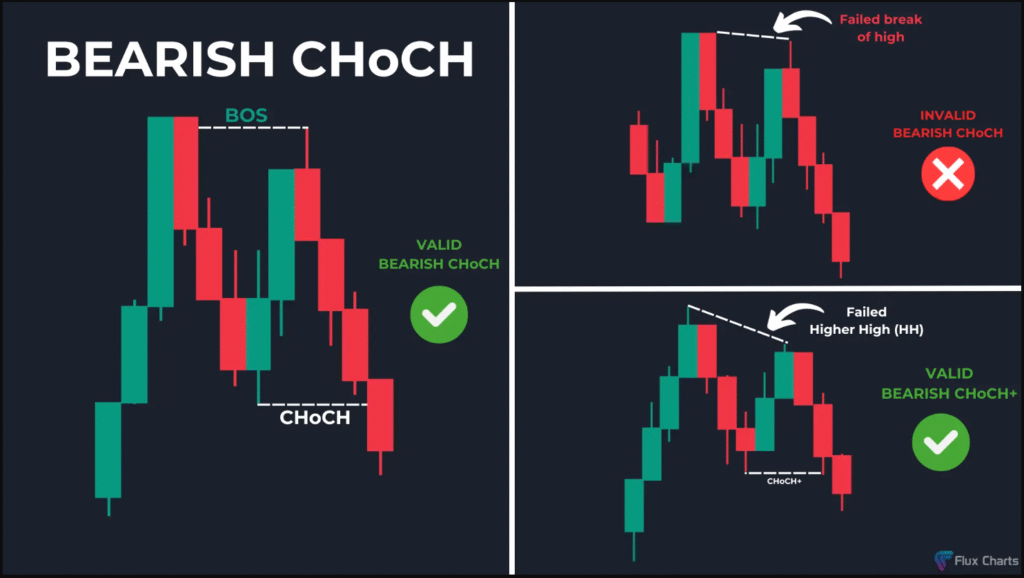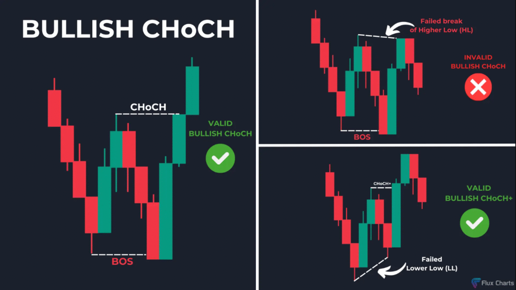 - CHoCH+ هو نسخة أقوى، تحدث عندما يفشل السعر في تشكيل كل من HH وHL (في الاتجاه الصاعد)، أو LL وLH (في الاتجاه الهابط).