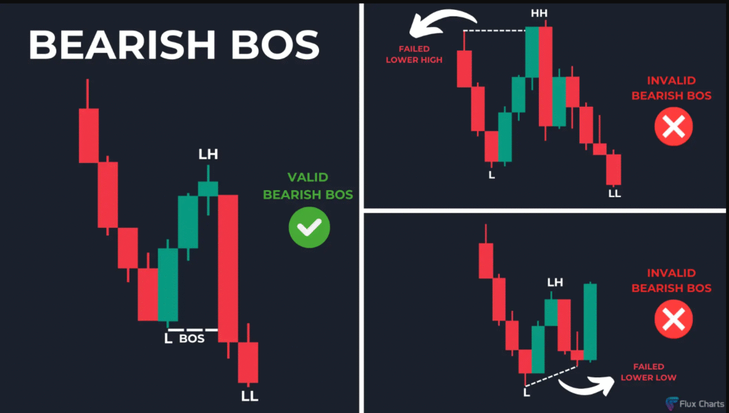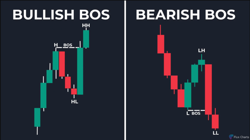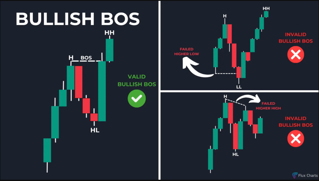 - في BOS الصاعد، يكون هناك قاع أعلى (HL) بعد قاع أدنى (LL)، متبوعًا بقمة أعلى.