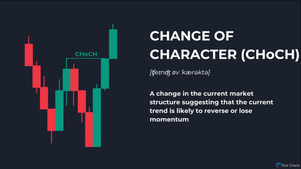 يشير تغيير السلوك (Change of Character – CHoCH) إلى تغير في هيكل السوق الحالي، مما يوحي بأن الاتجاه الحالي من المحتمل أن ينعكس أو يفقد زخمه.