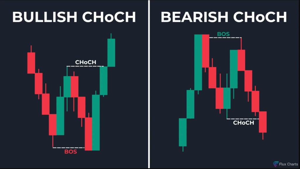 - CHoCH هو عندما يفشل BOS، ويتوقف السعر عن تشكيل قاع أعلى (HL) أو قمة أدنى (LH).